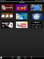 Channelsをタップすると、Tap Movies、KiDS TV、 App TV、Audiobooks、Documentary TV、HYPNO TV、Magic TV、Best of YouTube、Silent Moviesといった仮想のチャンネルが表示され、それぞれのチャンネルをタップすると、チャンネル分けされた動画作品が一覧表示されるようになっています。