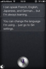 Siriに、話せる言語は何?(What language do you speak)と聞くと「私が話せるのは、フランス語、英語、日本語、そしてドイツ語です。私は常に学んでいます。」その後言語設定を変更することで対応言語を変えられると返事をしますが、iOS 5.0.1のSiriには日本語の設定はありません。