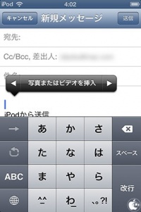 iOS 6から、メールの新規作成画面で、写真や動画ファイルの添付が可能になりました。