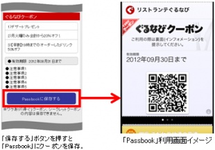 「ぐるなびスマートフォンWEB」のクーポンページにあるボタン「Passbookに保存する」を押すと、クーポンが「Passbook」に保存されます。