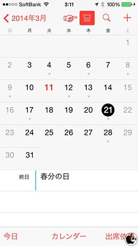 Appleが、iOS 7.1のカレンダー機能として、これまで月表示の場合、すでに入っているイベントをリスト表示させるために、検索アイコンをタップする必要があり、また、日付下にイベントが有る事を示すグレーボタンがある場合、その日付をタップすると、24時間表示になり、イベントを探すのが、とても不便でした。