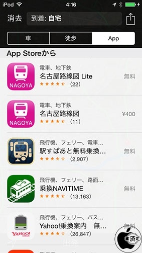 これまでのiOS 7のマップでは、経路情報を検索して他のアプリに転送する場合「交通機関での経路」を選択すると経路Appが表示され、任意のアプリに転送することが可能でしたが、iOS 8からは「ここへの道順」または「ここからの道順」を選択し、経路情報が表示されると、上部に「車」「徒歩」「App」のタブボタンが表示され、そこから別の経路アプリに転送する方式に変わりました。