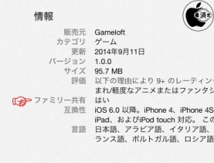 Appleが、iTunesのApp Storeで、各アプリの情報項目に「ファミリー共有」を追加しています。