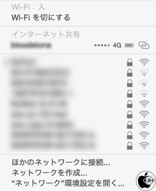 OS X Yosemiteがインストールされた、Bluetooth 4.0(BLE)仕様のMacでは、Wi-Fi 設定から iPhone ネットワークを選択します。