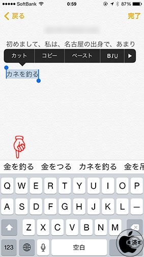 iOS 7までは、変換文字確定後に確定文字を選択して再変換することが出来ませんでしたが、iOS 8からは、確定した文字を選択すると、再び変換文字候補が表示されるようになっています。