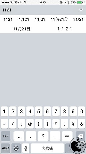 数字入力で、大きな桁数入力時に「,」が入った変換候補は表示されましたが、数字の桁数が4桁の場合、OS X Yosemiteと同じく「時間」または「日付」を変換候補として表示されるようになっています。