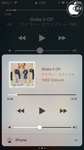 ミュージックコントロール機能が新しくなり、画面スワイプで表示され、楽曲再生中のアーティスト名、楽曲名に加えて、アルバムジャケットが表示されるようになりました。