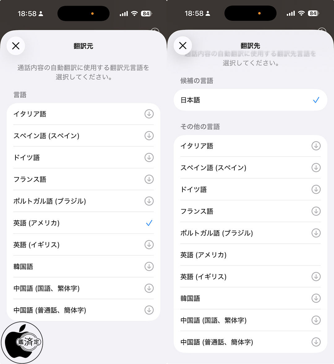 FaceTime のライブ翻訳は、英語 (英国、米国)、フランス語 (フランス)、ドイツ語、ポルトガル語 (ブラジル)、スペイン語 (スペイン) での 1 対 1 の通話で利用できます。