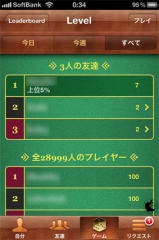 Leaderboardをタップすると、友達の成績と、全プレイヤーの成績ランキングが表示されます。