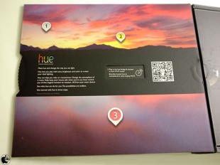 箱の中には、600ルーメン(50ワット相当)のhue電球3個、照明ネットワークを簡単にセットアップできるhueブリッジ(分配器)、hueブリッジ用電源アダプタ、LANケーブルとなっています。