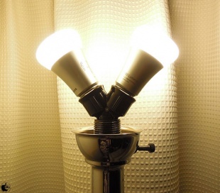 ホテルのスタンドライトを外し、そこに写真撮影用のソフトボックス用に持ち込んでいたダブルソケットを装着して、hue電球を装着しました。