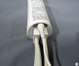マッサージ機のコントローラーに、足に巻くアタッチメントから伸びるホースを本体にセットし、また電源コードを接続します。