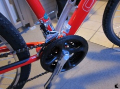 フロントは、シマノのクランクセット「FC-M131」ですが、カーボン調のデザインがされています。フロントディレーラーは「FD-TY10」で、2010年の生産終了モデルとの組み合わせのようです。