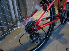 後輪ギヤは、シマノの7段マルチプルフリーホイールスプロケット「MF-TZ21」に、リアディレーラー「RD-TX35」という組み合わせで、市販車ではよくあるパターンがセットされています。