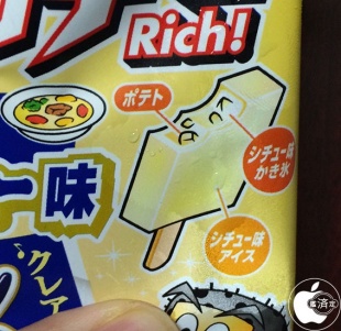 パッケージを見ると、北海道産じゃがいもを使用した冷凍ポテト、シチュー味かき氷を、シチュー味アイスで固めたアイスキャンディーのようです。