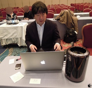 第4回神戸医療イノベーションフォーラムで、講演者として来ていた、林信行氏が、MacBook Pro (Retina)の横に、デーンとMac Pro (Late 2013)(評価機)を置いてましたw