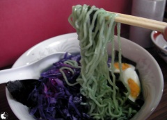 麺を箸で持ち上げてみると、麺がエメラルドグリーン色に染まってます。