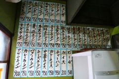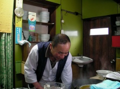 店:大きい方が大人用、小さい方が子供用なんだよ。近所の親ごさんがね、子供が勉強しないで怠けてる時、「菊やのアルカリラーメン食べて、頭良くしてもらってきなさい!」って叱るんだよね。そうすると、子供がやってきて、おじさんアルカリラーメン下さいって言うんだよ。次の日、テストかなんかがあったみたいで、その子供が「おじさん電池効かなかったよ」って言うんだよ。