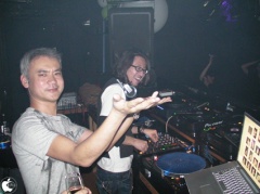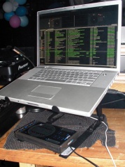 彼は、MacBook Pro (17-inch, Late 2008)に、RaneのScratch Liveを使ってDJを行なっていて、アウトボックスとして、RaneのRane SL 3を、コントローラーとして、StantonのDaScratchを、プレイ用の曲を全て入れた外付けの500GBHDを持込んでました。