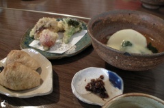 前菜として、自家製野菜の天ぷら、稲荷寿司、かぶの卵あんかけ、鰹節の佃煮などが出てきました。