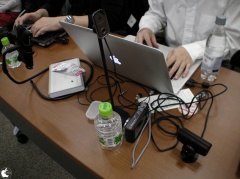 この前の「忘年会議2009」では、さらにパワーアップして、私が、最前列に席を確保していた場所に陣取り、iPhone 3GSは、iPhone用フレキシブルスタンドキット「NAJA King iPhone」を使って設置し、MacBook Pro (15-inch, Early 2009)には、MacBookシリーズ用外部バッテリー「HyperMac」で電源の確保と、マイクロソフトの静止画760万/動画200万性能WEBカメラ「LifeCam Show」と、ソニーのPS3用USBカメラ「PLAYSTATION Eye」の2台を接続して中継体制を整えてました。