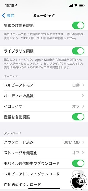 ロスオーディオは、Apple Musicの設定>オーディオのオーディオの品質で「ロスレスオーディオ」のオン/オフが行えます。(デフォルトはオフ)
