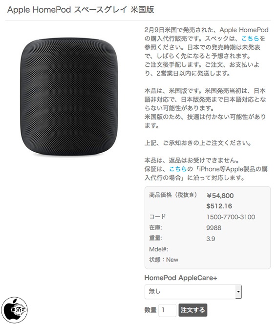 Vintage Computer、HomePodを54,800円で販売中(日本まで最短3日間で着荷)