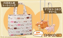 付録には、本誌限定柄のトートバッグ(タテ23×ヨコ32×マチ6.5cm)と、でぶネコ茶トラ&ちびネコピンクのチャームが2つ付いてきます。