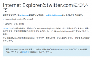 Twitterが、サポート情報「Internet Explorerとtwitter.comについて」を公開し、Internet Explorer 9 以前、Safari 6 以前でアクセスする場合、twitter.comの一部の機能は、旧バージョンのInternet ExplorerとSafariで利用出来ないため、対象のブラウザーで最大限快適に利用するため「mobile.twitter.com」にリダイレクトされると説明しています。