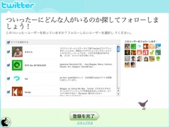 2009年07月27日(月) etc / Twitter#Twitter#おすすめのユーザー Twitterの新規アカウント作成で、おすすめのユーザーはデフォルト ※本サイトは、アフィリエイト広告および広告による収益を得て運営しています。購入により売上の一部が本サイトに還元されることがあります。 Twitterが、友だちを検索に追加した「おすすめのユーザー」ですが、Twitterを新規登録する場合、登録を完了の前に、おすすめのユーザーが全てチェックが付いた状態で表示されるように変わっていました。 アカウント個別にチェックを外したり、全てを選択するのチェックを外せばフォローしなくても良いのですが、初めての人には、このフォローしたいユーザー選択の意味は分からないため、ほとんどは、自動的におすすめのユーザーをフォローしてしまうと思います。 よって、おすすめのユーザーは、選んでフォローされるわけじゃないアカウントにもなると思います。
