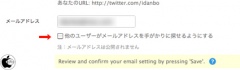 2010年02月19日(金) etc / Twitter#Twitter Twitter、設定のユーザー情報で、メールアドレスによる検索がデフォルトオンになっている。 ※本サイトは、アフィリエイト広告および広告による収益を得て運営しています。購入により売上の一部が本サイトに還元されることがあります。 Twitterが、設定のユーザー情報で、メールアドレスの部分に「他のユーザーがメールアドレスを手がかりに探せるようにする」を追加し、デフォルトでオンになっているそうです。 メールアドレスによる検索を可としない方は、設定のチェックを外す事をお勧めします。