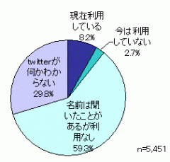 調査期間は2010年1月18日〜20日で、回答数は5,451件の結果によると、Twitterの認知は70.2%にのぼりますが、実際に利用している人は8.2%にとどまるという結果だったと報告されています。