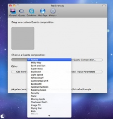最初に、Finderのメニューバーに追加されるMach Desktopをクリックして、Preferencesから、Quartzを選択し、Choose a Quartz compositionから、デスクトップに表示したいスクリーンセーバーを選択します。