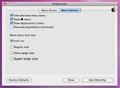 Menu Optionsタブには、表示させるFinderメニューのカテゴリーと、フォントサイズの変更も出来るようになっています。