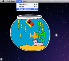 このアプリですが、FinderメニューのFish>Drop a batteryを選択すると、金魚鉢にバッテリーが落ち、金魚が感電死して骨だけになってしまいます。