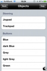 右上のプラスボタンをタップして、配置出来るオブジェクトパーツとして、ジョイパッド、トラックパッド、ボタンなどに加え、加速度センサーも細かく設定することが出来ます。