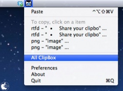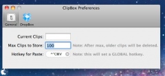 メニューのClipBoxアイコンをクリックすると、DropBoxに送信された履歴が表示され、任意のファイルを選択して、Paste(control + option + shift +command + V)を選ぶと、クリップボードの内容が指定したファイルに入れ替わります。