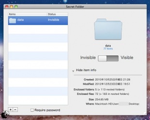 Apimacが、Mac用フォルダ不過視化アプリ「Secret Folder」を、Mac App Storeにて販売していたので試してみました。