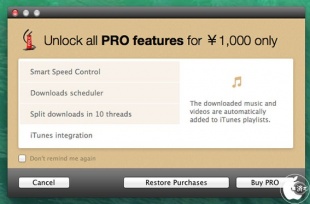 1,000円でPRO版にアップグレードすると、ダウンロード速度コントロール、ダウンロードスケジュール設定、iTunes自動登録機能などが利用出来ます。