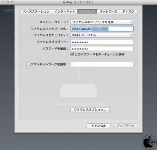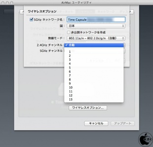 AirMac Extreme、AirMac Express、Time Capsuleなどは、AirMacユーティリティで、ワイヤレスタブの一番下にある「ワイヤレスオプション」をクリックします。
