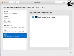 アプリをダウンロードしたら、システム環境設定>機能拡張>写真で、DxO OpticsPro for Photosの項目にチェックを入れて有効にします。