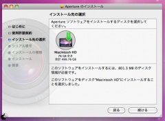 さっそくインストールしてみました。Aperture 2がインストールされている環境に対してのアップグレードの場合、801.3MBのディスク領域が必要となるようです。