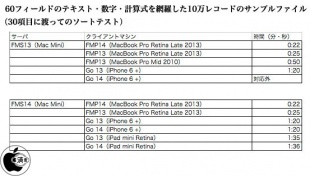 FileMaker Pro 14とFileMaker Pro 13を使用して、60フィールドのテキスト・数字・計算式を網羅した10万レコードのサンプルファイルを使用して、30項目に渡ってのソートテストを実行し、ベンチマーク計測を行ないました。