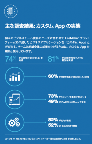 ファイルメーカーが、FileMakerプラットフォームを導入しているユーザー企業に対して行った実態調査の報告書「カスタム App 利用状況調査」を発表しています。