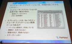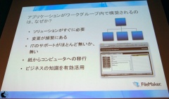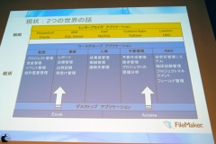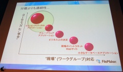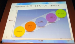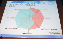 FileMaker Proをエンタープライズツールとして見てみると、導入コストが低く、使い勝手が良いとは思うが、飛行機予約システムといった大規模システム向けに開発されたソフトウェアではないと説明し、ワークグループツールとエンタープライズツールの2つは、重なる部分はあるが、FileMaker Proは、ワークグループツールとしての位置を重要視していると説明した。