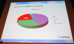 次に「FileMaker ビジネスアップデート」として、同社は年100万本ペースで出荷を続けていて、 11年前に創立してからずっと売上を伸ばし続け、総計1,500万本出荷していると説明した。