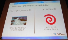 ウォーターフォール型は、ダイナミックではないビジネスプロセスなのに対し、スパイラル型は、ダイナミックなビジネスプロセスだと説明し、釘で打つか、ネジで締めるかといった感じで、目的は同じだが、それによってプロセスは変わってくると説明した。