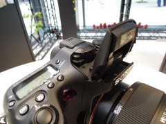 マウンターの前にステレオマイクが装備されていて、内蔵ストロボは、前にせり出して建つ感じでポップアップします。
