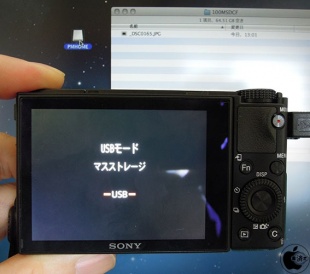 micro USBケーブルでMacに接続すると、マスストレージモードに変わり、SDカードをデスクトップマウントして、素早く写真データーが取り出せるため、速報型記事を書く上でも重宝しそうです。