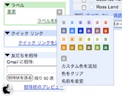 2008年09月15日(月) etc / インターネット#Gmail#Google Google、GmailのGmail Labsに「カスタム色」を追加 ※本サイトは、アフィリエイト広告および広告による収益を得て運営しています。購入により売上の一部が本サイトに還元されることがあります。 カスタム色 Goolgeが、GmailのGmail Labsにカスタム色を追加したと発表しています。 この機能を有効にするには、Gmailの設定で、Gmail 表示言語を「English (US)」に切換えます。 Settings SettingsのLabsにある「Custom Label Colors」のEnableをチェックし、Gmail 表示言語を日本語に戻します。 ラベルのプルダウンメニューをクリックすると「カスタム色を追加」の項目が増えています。 カスタム色を追加は、テキストカラーだけでなく、背景色も変更することが可能になっています。